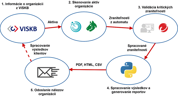 - Mesačné skenovanie a odosielanie reportov. Spúšťanie mesačných automatizovaných bezpečnostných skenov na overenie zabezpečenia serverov a webových služieb pre jednotlivé organizácie, ktoré udržiavajú aktuálny zoznam kontaktov a aktív vo Vládnom informačnom systéme kybernetickej bezpečnosti (VISKB).
