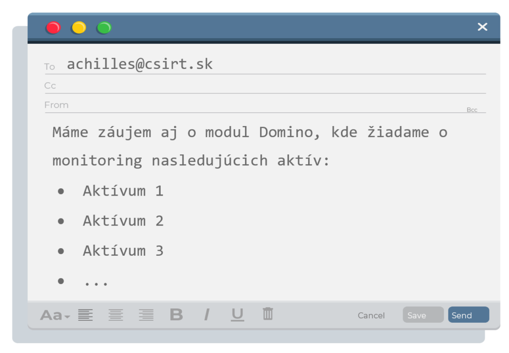 V rámci registrácie nás treba kontaktovať na e-mailovej adrese achilles@csirt.sk s nasledujúcim textom: